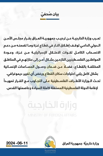 وذكرت وزارة الخارجية في بيان أنها "تعرب عن ترحيب جمهورية العراق بقرار مجلس الأمن الدولي الداعي لوقف إطلاق النار في قطاع غزة وما تضمنه من دعم الانسحاب الكامل لقوات الاحتلال الإسرائيلية من غزة، وعودة المواطنين الفلسطينيين النازحين بشكل آمن إلى منازلهم في المناطق المختلفة بالقطاع، فضلاً عن ضمان وصول المساعدات الإنسانية بشكل كامل يلبي احتياجات سكان القطاع ورفض أي تغيير ديموغرافي".
