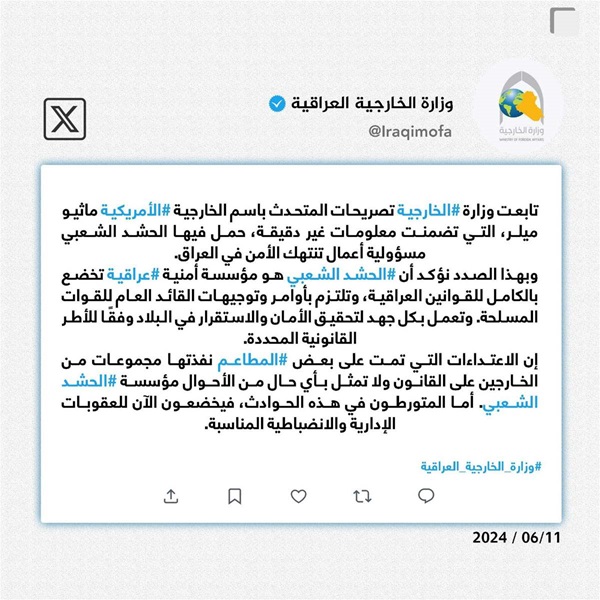 وذكر بيان للوزارة أنه "تابعت وزارة الخارجية تصريحات المتحدث باسم الخارجية الامريكية ماثيو ميلر، التي تضمنت معلومات غير دقيقة، حمل فيها الحشد الشعبي مسؤولية اعمال تنتهك الأمن في العراق".