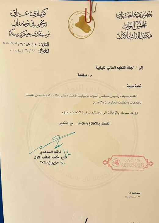 وجه رئيس مجلس النواب بالانابة محسن المندلاوي لجنة التعليم النيابية بعقد اجتماع عاجل وطارئ لمعالجة حالات الرسوب في الجامعات والكليات الحكومية والاهلية بالامتحانات الوزارية التقويمية