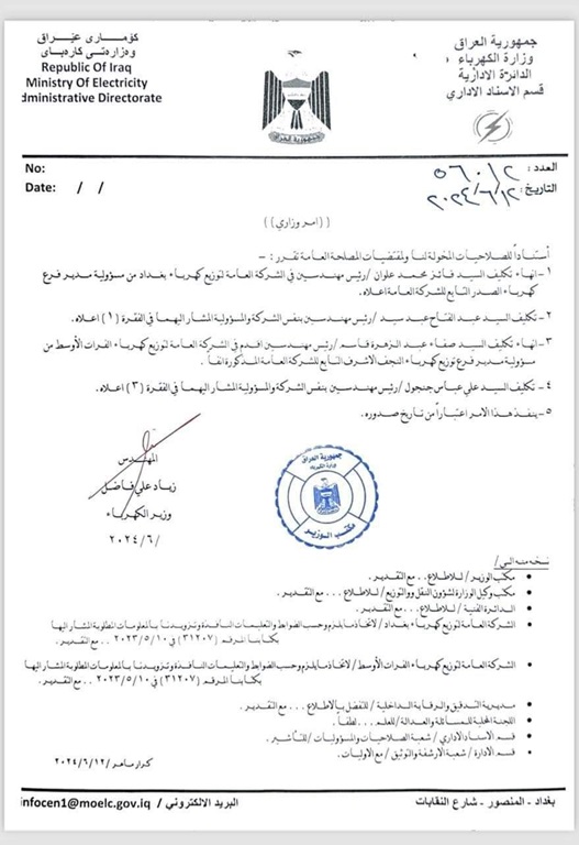 كما انهى وزير الكهرباء "تكليف (صفاء عبد الزهرة قاسم)، رئيس مهندسين أقدم في الشركة العامة التوزيع كهرباء الفرات الأوسط من مسؤولية مدير فرع توزيع كهرباء النجف الاشرف التابع للشركة العامة المذكورة انفاً، وتكليف (علي عباس جنجول) رئيس مهندسين بنفس الشركة".