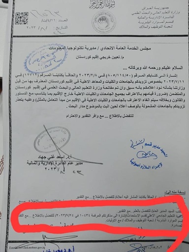 وفي (23 آب لعام 2023)، ابلغت وزارة التعليم العالي والبحث العلمي الاتحادية، مجلس الخدمة الاتحادي بعدم الموافقة على تعيين خريجي جامعات اقليم كردستان ان لم تلتزم حكومة الاقليم بالاعتراف بالجامعات العراقية الاهلية التي ترفض اربيل الاعتراف بها.