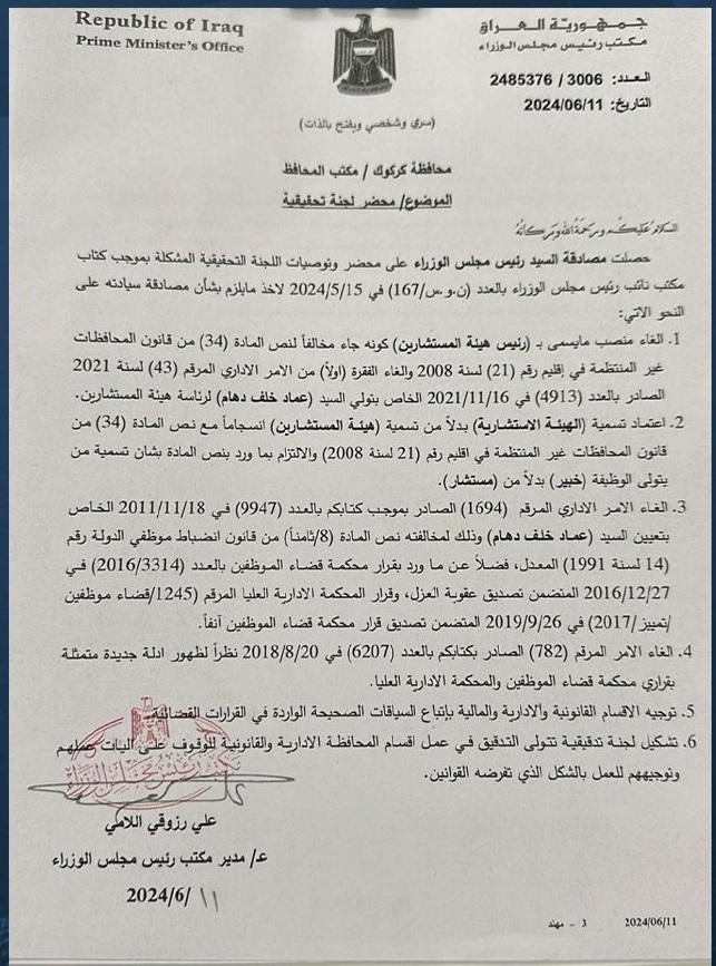قرر رئيس مجلس الوزراء، محمد شياع السوداني، اليوم الأحد، (23 حزيران 2024)، عن إلغاء منصب رئيس هيئة المستشارين في محافظة كركوك وإعادة تسميتها إلى "الهيئة الاستشارية" دون تعيين رئيس لها.