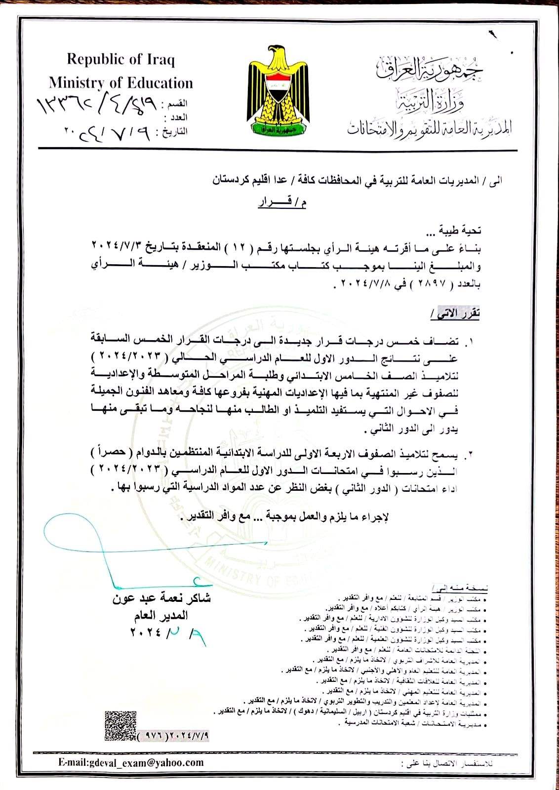 نص قرار وزارة التربية الخاص بإضافة 5 درجات والسماح للراسبين بأداء الدور الثاني.
