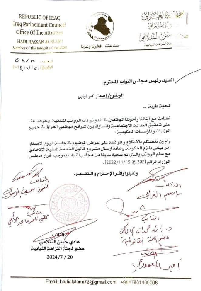 واشار السلامي بحسب وثيقة ، الى انه "تضامنا مع أبنائنا وأخوتنا الموظفين في الدوائر ذات الرواتب المتدنية وحرصا منا على تحقيق العدالة الاجتماعية والمساواة بين شرائح موظفي العراق في جميع الوزارات والمؤسسات الحكومية راجين تفضلكم بالاطلاع والموافقة على عرض الموضوع في جلسة اليوم لاصدار امر نيابي يلزم الحكومة بإعادة ارسال مشروع قانون الخدمة المدنية الاتحادي مع سلم الرواتب والذي تم سحبه سابقا من مجلس النواب".