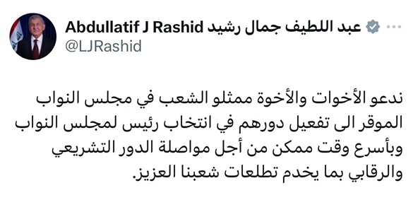 خاطب رئيس الجمهورية عبد اللطيف جمال رشيد بتغريدة، تابعتها "بغداد اليوم"، اليوم الثلاثاء (23 تموز 2024)، مجلس النواب الى تفعيل دورهم في انتخاب رئيس لمجلس النواب وبأسرع وقت ممكن من أجل مواصلة الدور التشريعي والرقابي بما يخدم تطلعات شعبنا العزيز.