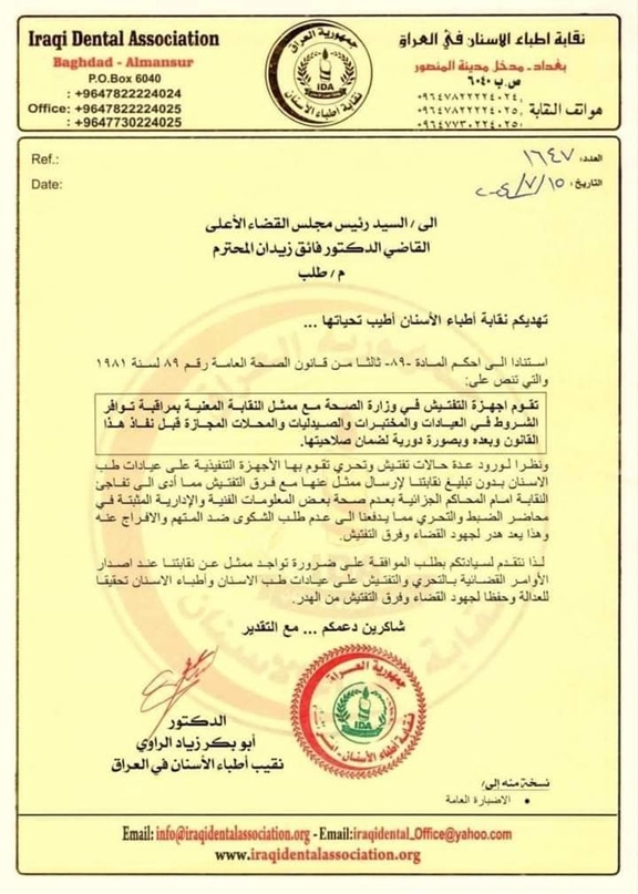 وقالت نقابة أطباء الاسنان في العراق في وثيقة اليوم الثلاثاء (23 تموز 2024)، إنه "نظراً لورود عدة حالات تفتيش وتحري تقوم بها الأجهزة التنفيذية على عيادات طب الاسنان بدون تبليغ نقابتنا لإرسال ممثل عنها مع فرق التفتيش مما أدى الى تفاجئ النقابة امام المحاكم الجزائية بعدم صحة بعض المعلومات الفنية والإدارية المثبتة في محاضر الضبط والتحري مما يدفعنا الى عدم طلب الشكوى ضد المتهم والافراج عنه وهذا يعد هدر لجهود القضاء وفرق التفتيش".