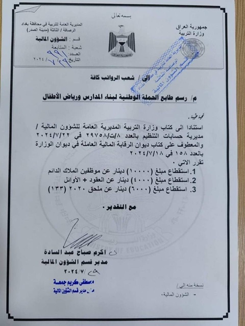 أظهرت وثيقة صادرة عن وزارة التربية اليوم الاثنين (29 تموز 2024)، توجيها باستقطاع مبالغ مالية من موظفيها للحملة الوطنية لبناء المدارس ورياض الأطفال.