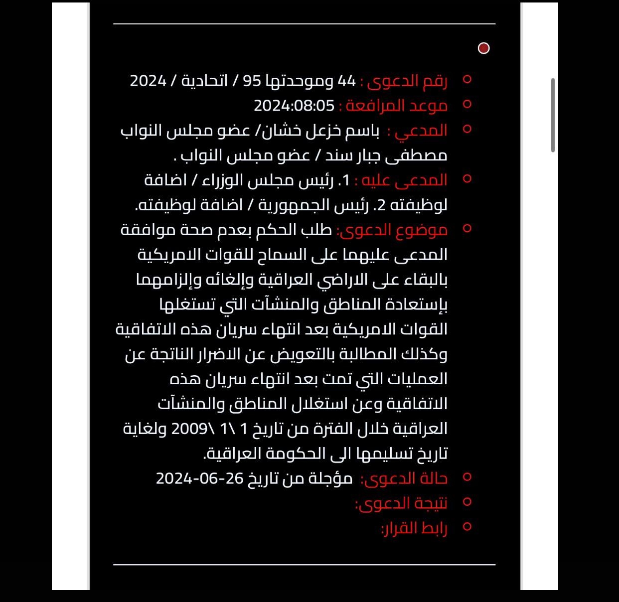 قررت المحكمة الاتحادية العليا، اليوم الاثنين (5 آب 2024)، رد الدعوى بشأن بقاء القوات الأمريكية في العراق لعدم الاختصاص.