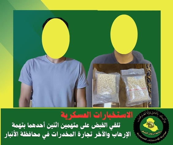 أعلنت مديرية الاستخبارات العسكرية، اليوم الخميس، (15 آب 2024)، عن إلقاء القبض على متهمين اثنين أحدهما بتهمة الإرهاب والآخر تجارة المخدرات في محافظة الأنبار.