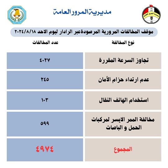 وبلغ مجموعة المخالفات لهذا اليوم فقط 4974 مخالفة تنوعت بين تجاوز السرعة المقررة وعدم ارتداء الأمان واستخدام الهاتف النقال ومخالفة الممر الأيسر لمركبات الحمل والباصات.