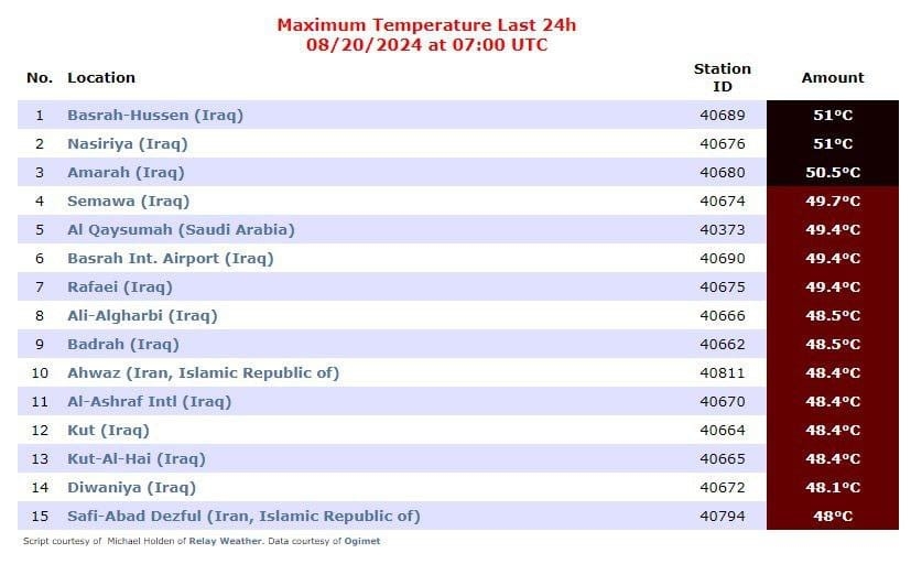 وسجلت محافظة البصرة اعلى درجة حرارة عالمياً حيث بلغت 51 درجة مئوية، فيما سجلت مدينتي الناصرية والعمارة درجة حرارة اعلى من 50 درجة مئوية.
