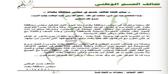 اعلن تحالف الحسم الوطني انسحابه من كتلة بغداد بمجلس المحافظة.