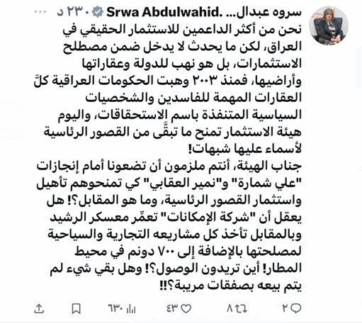 وقالت عبد الواحد في تغريدة "نحن من أكثر الداعمين للاستثمار الحقيقي في العراق، لكن ما يحدث لا يدخل ضمن مصطلح الاستثمارات، بل هو نهب للدولة وعقاراتها وأراضيها"، مشيرة الى انه "منذ ٢٠٠٣ وهبت الحكومات العراقية كلَّ العقارات المهمة للفاسدين والشخصيات السياسية المتنفذة باسم الاستحقاقات، واليوم هيئة الاستثمار تمنح ما تبقَّى من القصور الرئاسية لأسماء عليها شبهات".