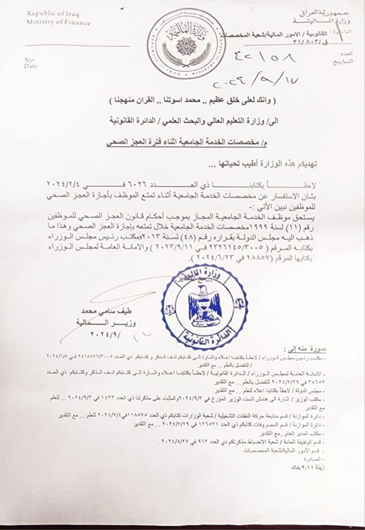 أعلنت وزارة المالية، اليوم الخميس، (26 أيلول 2024)، أستحقاق مخصصات الخدمة الجامعية لموظفين الخدمة الجامعية خلال تمتعه بالإجازة الممنوحة بموجب أحكام قانون العجز الصحي، وكما موضح في الكتاب اعلاه