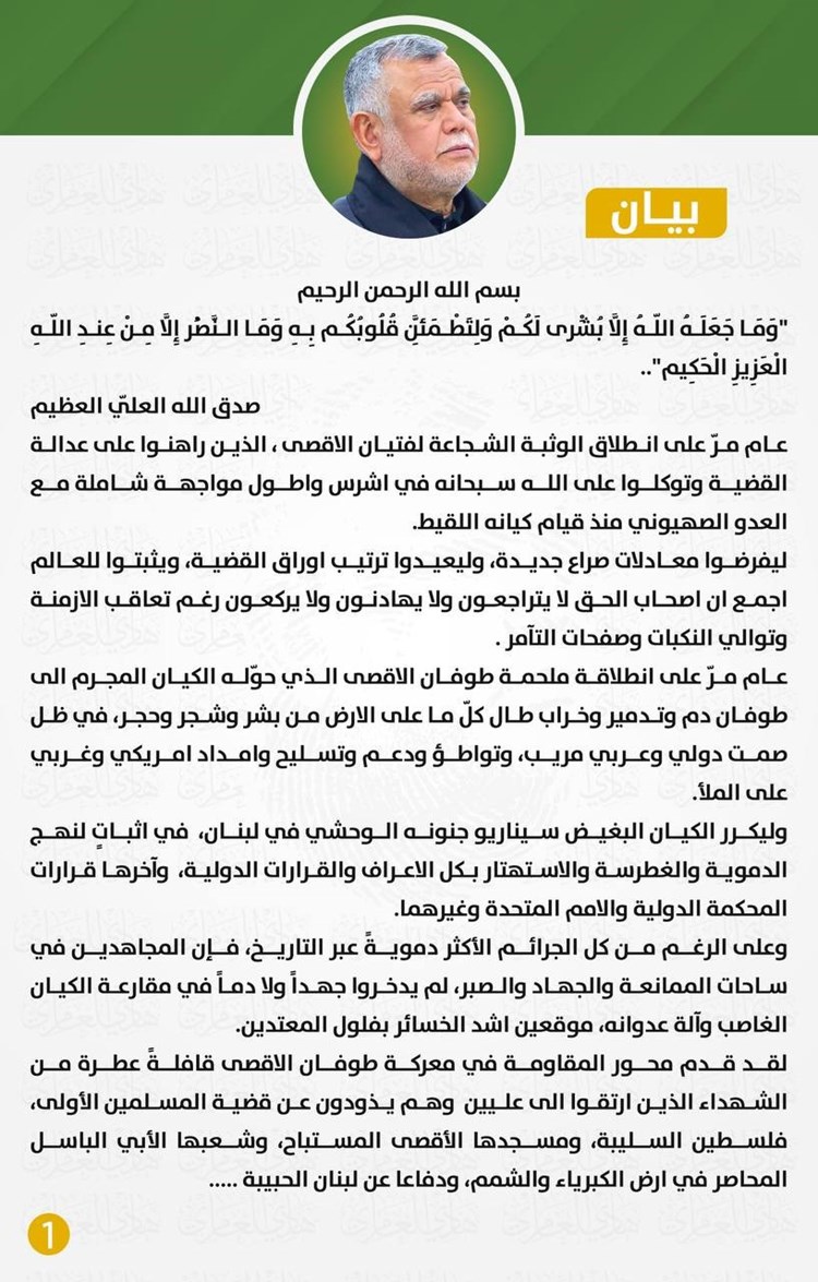 العامري يثمن جهود المقاومة ويدعو لاعلاء راية الحق ضد المعتدي الصهيوني