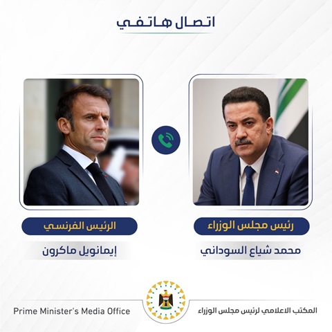 وقال المكتب الإعلامي لرئيس مجلس الوزراء في بيان، إن "السوداني أجرى اتصالاً هاتفياً مع ماكرون، تناول فيه العلاقات الثنائية بين البلدين، إلى جانب التباحث في قضايا تتصل بالوضع الراهن في المنطقة، والاستمرار بتنسيق المواقف في هذه المرحلة الحرجة التي تمرّ بها المنطقة والعالم".
