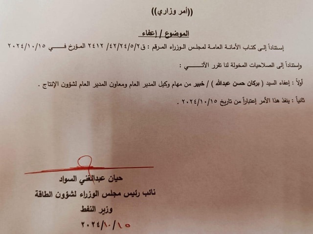 وبحسب وثيقة صادرة في الخامس عشر من الشهر الحالي، ، فأنه "إستناداً إلى كتاب الأمانة العامة لمجلس الوزراء المرقم: ق 42/24/5/2 / 2412 المؤرخ في 15/10/2024 تقرر إعفاء (بركان حسن عبد الله) / خبير من مهام وكيل المدير العام ومعاون المدير العام لشؤون الإنتاج، على ان ينفذ هذا الأمر اعتبارا من تاريخ 15/10/2024".