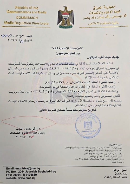 وقال المؤيد في بيان" انه استناداً للصلاحيات المخولة لنا في تنظيم قطاعات الإعلام والاتصالات وتكنولوجيا المعلومات في جمهورية العراق بموجب الأمر (٦٥) لسنة ۲۰۰٤ النافذ، ونظراً لما تم رصده في الوسائل الإعلامية على المدعو انتفاض قنبر بطرح مضامين في وسائل الاعلام تخالف لائحة قواعد البث الإعلامي وتحديداً المواد الآتية: