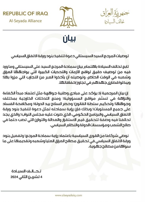 أشاد تحالف السيادة، اليوم الاثنين (4 تشرين الثاني 2024)، ببيان المرجع الديني السيد علي السيستاني، مبيناً أنه يمثل دعوة للقوى السياسية لتنفيذ الاتفاق السياسي والبرنامج الحكومي.