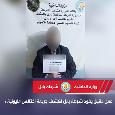 وقال مدير اعلام شرطة بابل العميد عادل الحسيني "انه وبناءً على بلاغ ورد من المصرف، باشرت الشعبة إجراء تحقيق موسع شمل متابعة كاميرات المراقبة، واستجواب الموظفين، وتحليل السجلات المالية ، ما أدى إلى التوصل إلى المتهم الذي اعترف بارتكاب الجريمة .
