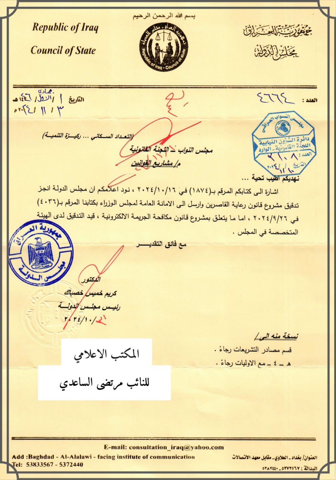 ابلغ مجلس الدولة ، مجلس النواب رسميا ، ان مشروع قانون مكافحة الجريمة الالكترونية مايزال قيد التدقيق حاليا ، فيما تم ارسال مشروع تعديل قانون رعاية القاصرين الى الامانة العامة لمجلس الوزراء بعد تدقيقه