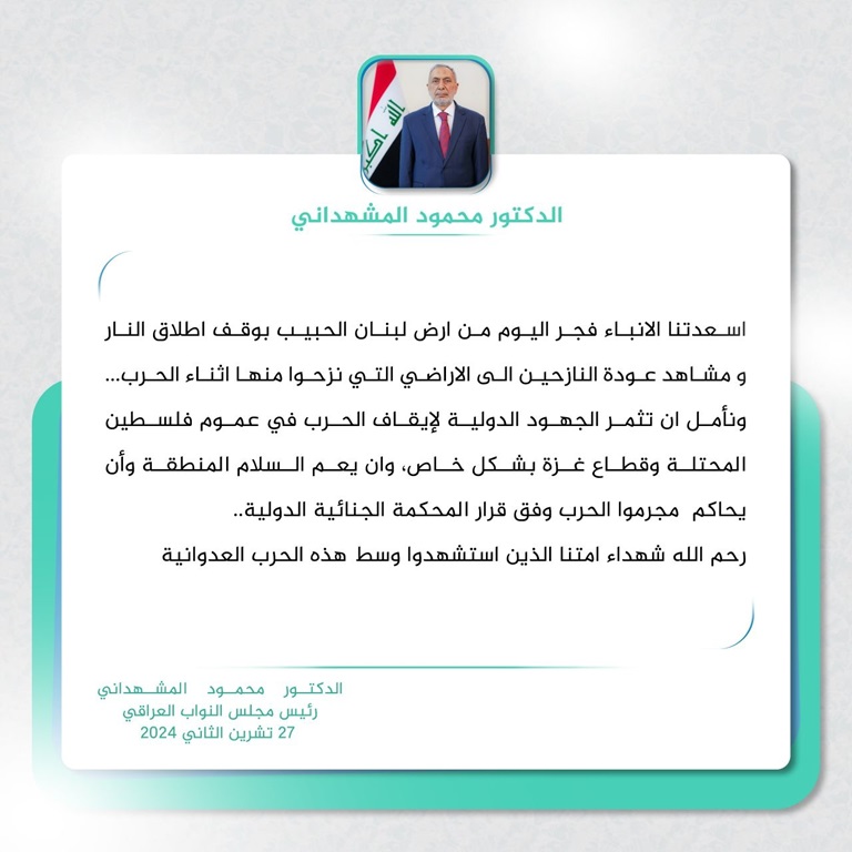 وكتب المشهداني في تغريدة على حسابه الشخصي بمنصّة "إكس" ": اسعدتنا الانباء فجر اليوم من ارض لبنان الحبيب بوقف اطلاق النار مشاهد عودة النازحين الى الأراضي التي نزحوا منها اثناء الحرب".