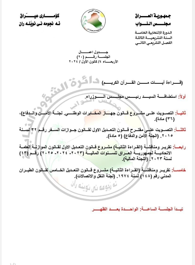نشرت الدائرة الإعلامية لمجلس النواب، اليوم الثلاثاء (3 كانون الأول 2024)، جدول أعمال جلسة البرلمان ليوم غد الأربعاء، والتي تضمنت استضافة رئيس الوزراء محمد شياع السوداني.