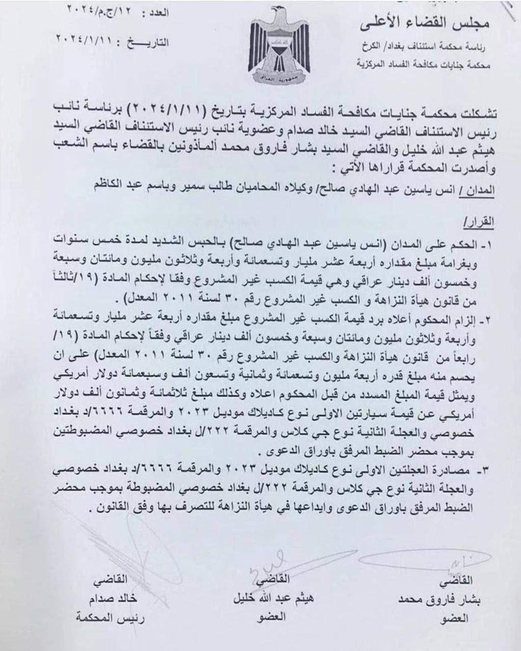 اصدرت محكمة جنايات مكافحة الفساد المركزية ، حكماً بالحبس الشديد 5 سنوات بحق انس ياسين عبد الهادي مدير تقاعد الانبار السابق مع غرامة مالية اكثر من 14 مليار دينار.