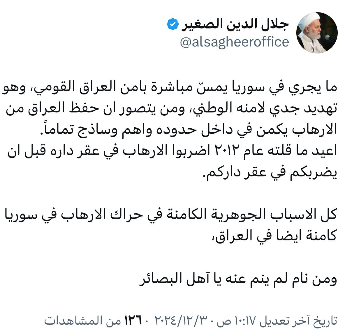 الشيخ جلال الدين الصغير مغردا : ما يجري في سوريا يمس مباشرة بالامن القومي العراقي