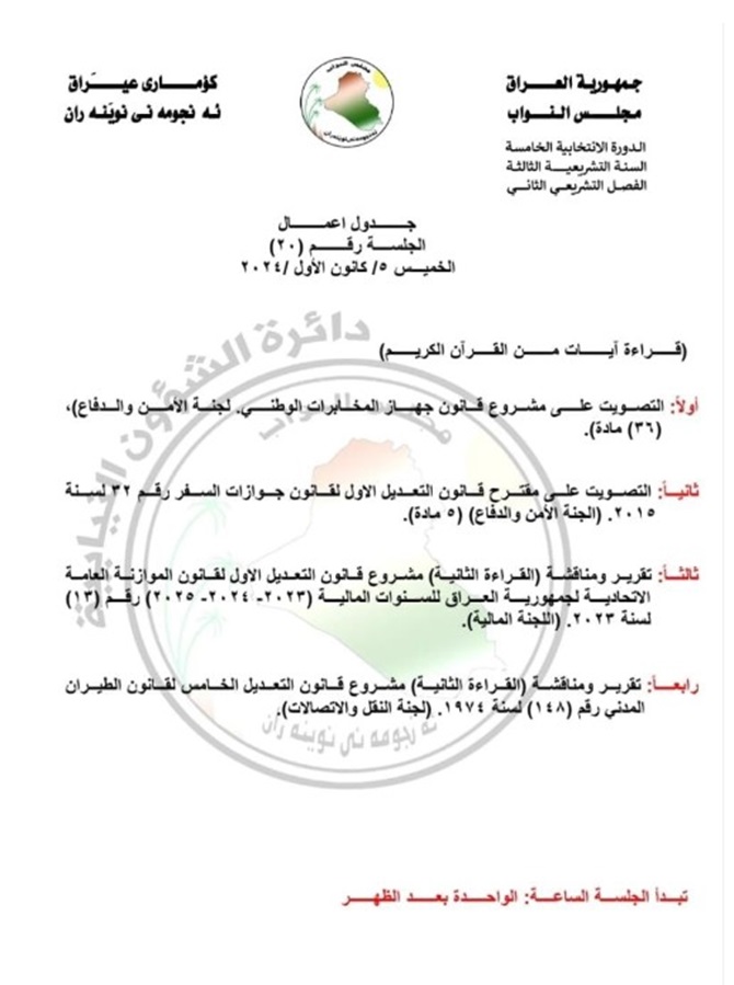 وتابعت ان "جدول الاعمال يتضمن مناقشة القراءة الثانية لمشروع قانون التعديل الخامس لقانون الطيران المدني رقم (148) لسنة 1974".