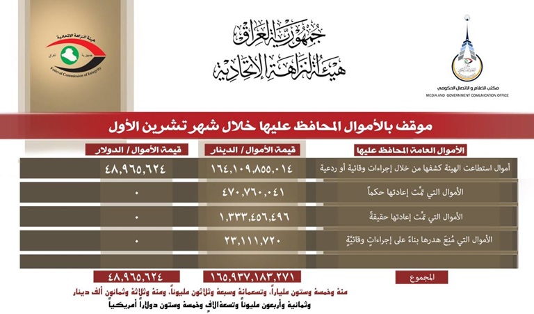 أعلنت هيئة النزاهة، اليوم الخميس (5 كانون الأول 2024)، موقف الأموال المُحافظ عليها خلال شهر تشرين الأول لعام 2024، فيما أشارت إلى أن قيمة تلك الأموال وصلت إلى مئة وخمسة وستون مليارًا وتسعمائة وسبعة وثلاثون مليونًا، وثلاثة وثمانون ألف دينار، وثمانية وأربعون مليونًا وتسعة الاف وخمسة وستون دولارًا أمريكيًا.