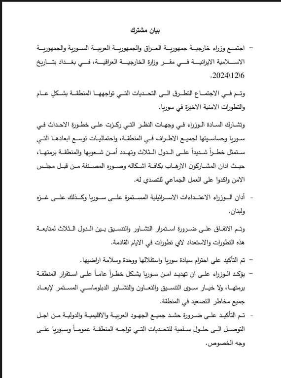 واكدوا في البيان المشترك لاجتماعهم في بغداد ، ضرورة احترام سيادة سوريا واستقلالها وسلامة اراضيها .
