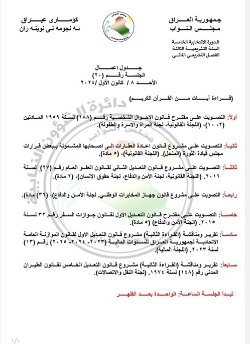 جدول أعمال مجلس النواب العراقي ليوم غد الأحد.