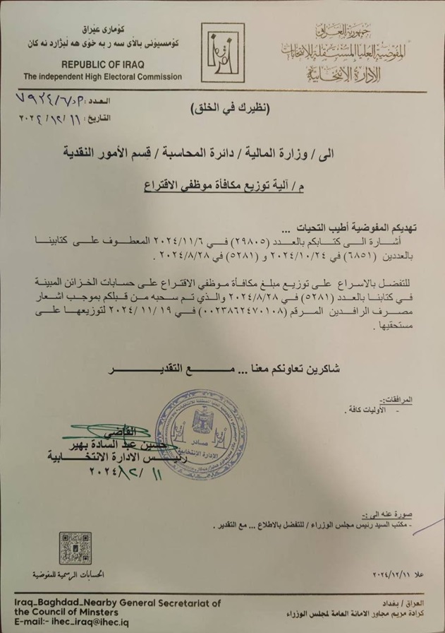 خاطبت المفوضية العليا المستقلة للانتخابات، وزارة المالية لصرف مكافأة موظفي الاقتراع.
