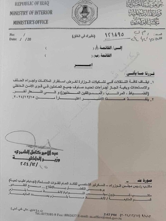 وجه وزير الداخلية، عبد الأمير الشمري، بإيقاف التنقلات في تشكيلات الوزارة لغرض استقرار الملاكات وإجداء الحذف والاستحداث.