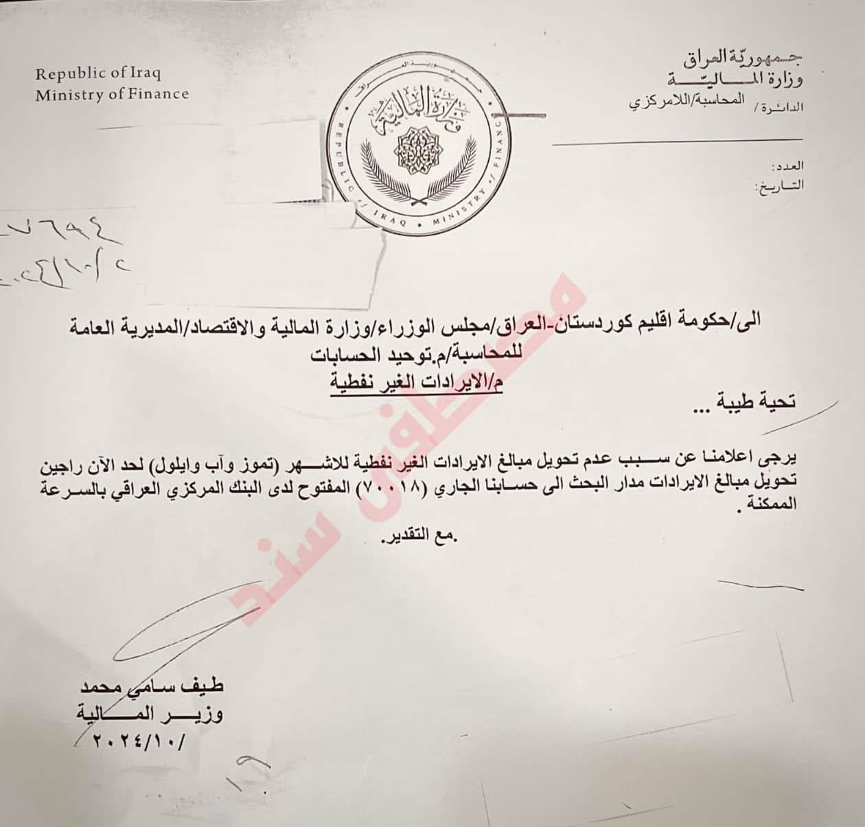 النائب مصطفى سند ينشر في حسابه الخاص وثيقة من وزارة المالية تظهر عدم تسديد اقليم كردستان العراق الإيرادات غير النفطية