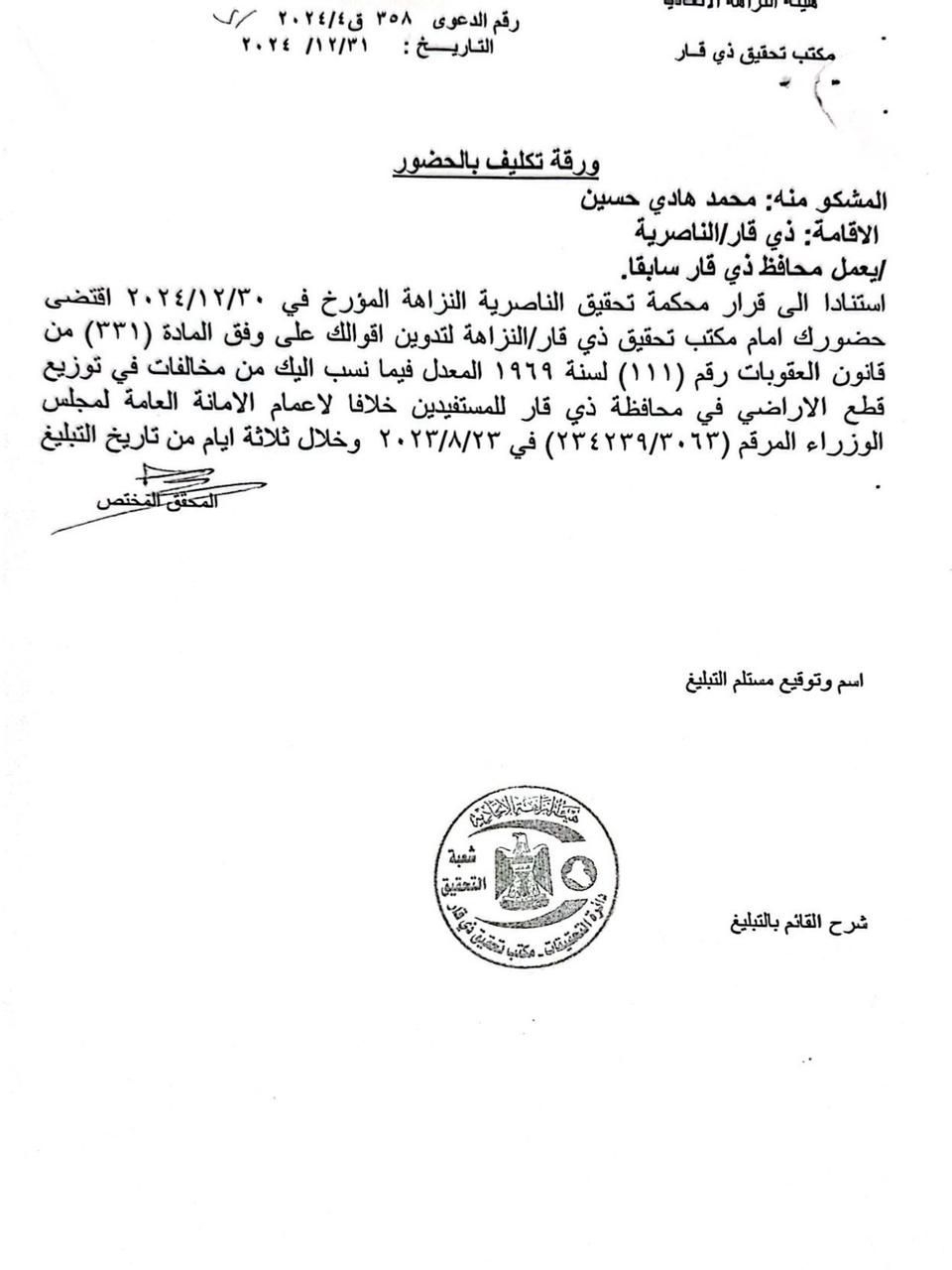 اثر مخالفات في توزيع الأراضي محكمة ذي قار تستدعي المحافظ السابق محمد الغزي