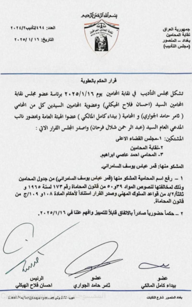 قرر مجلس التأديب في نقابة المحامين شطب اسم المحامية قمر السامرائي من جدول المحامين