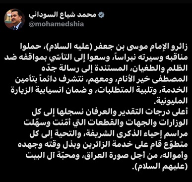 وقال السوداني في تدوينة له على حسابه في منصة إكس "زائرو الإمام موسى بن جعفر (عليه السلام)، حملوا مناقبه وسيرته نبراساً، وسعوا إلى التأسّي بمواقفه ضد الظلم والطغيان، المستندة إلى رسالة جدّه المصطفى خير الأنام، ومعهم، نتشرف دائماً بتأمين الخدمة، وتلبية المتطلبات، وضمان انسيابية الزيارة المليونية".