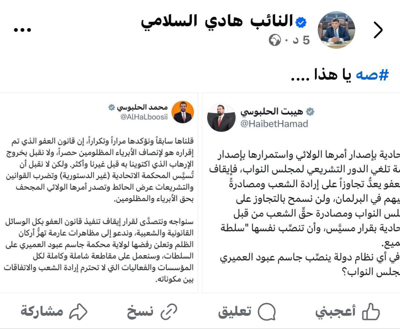 النائب هادي السلامي يرد على تهجم الحلبوسي وغلمانه على القضاء العراقي بـ صه ياهذا