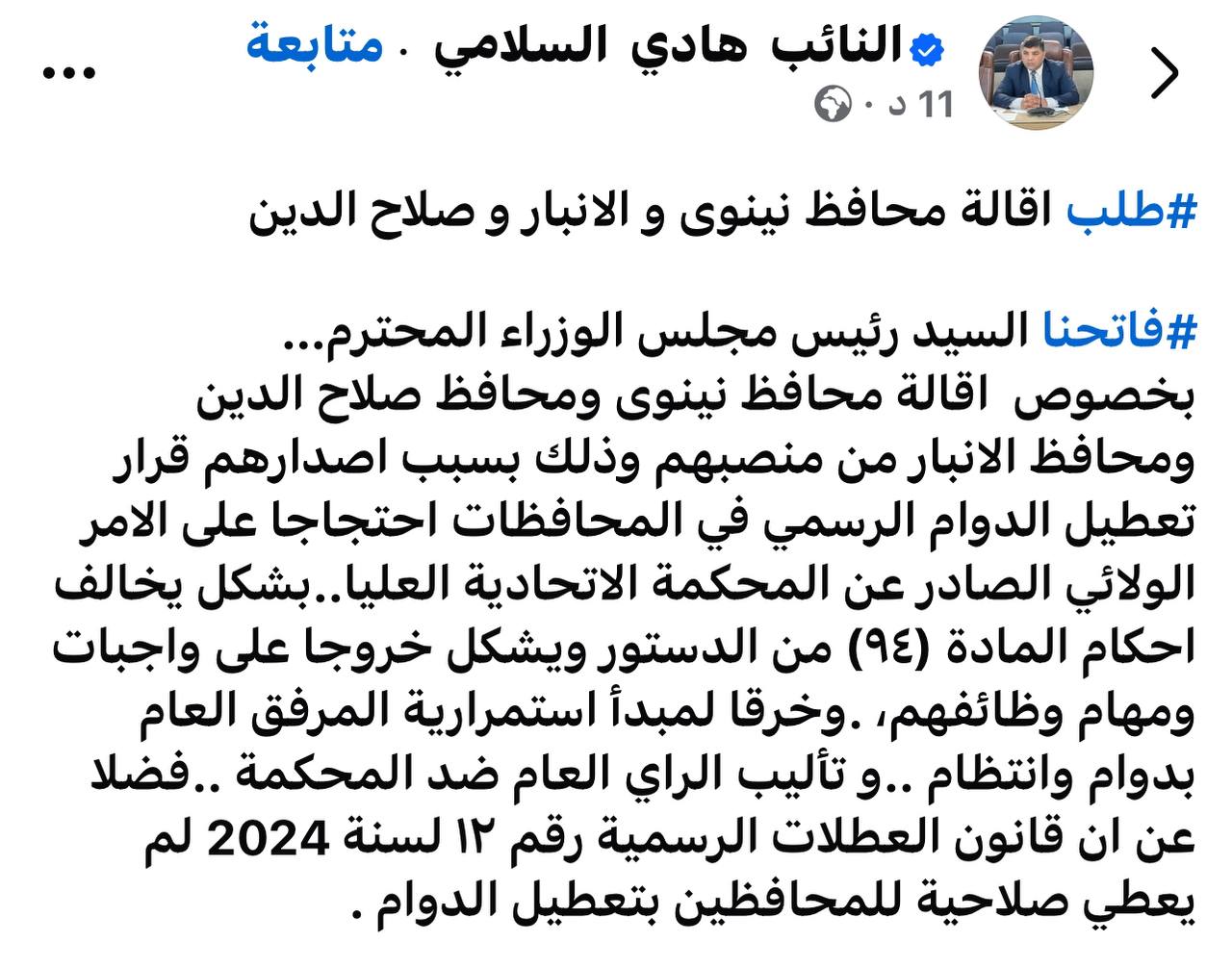 النائب هادي السلامي يفاتح رئيس الوزراء لاقالة محافظي الأنبار ونينوى وصلاح الدين