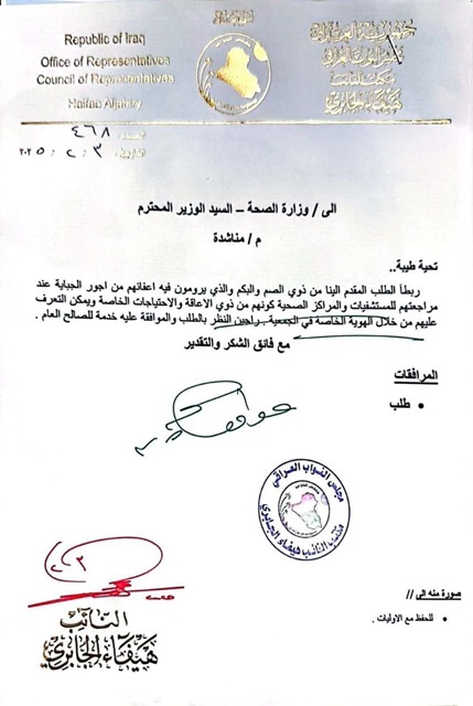 وبحسب رد الوزير على طلب نيابي، فان مراجعة الشريحة المعفاة الى المستشفيات والمراكز الصحية تكون مجاناً لكونهم من ذوي الاعاقة والاحتياجات الخاصة ، بعد ابرازهم الهويات الخاصة بهم.