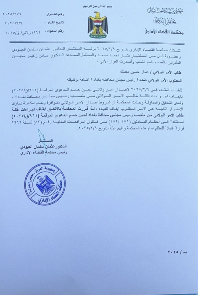 وكانت مجلس محافظة بغداد قد صوت في 6 شباط 2025، على إقالة رئيسه عمار القيسي، بالأغلبية المطلقة للأعضاء.