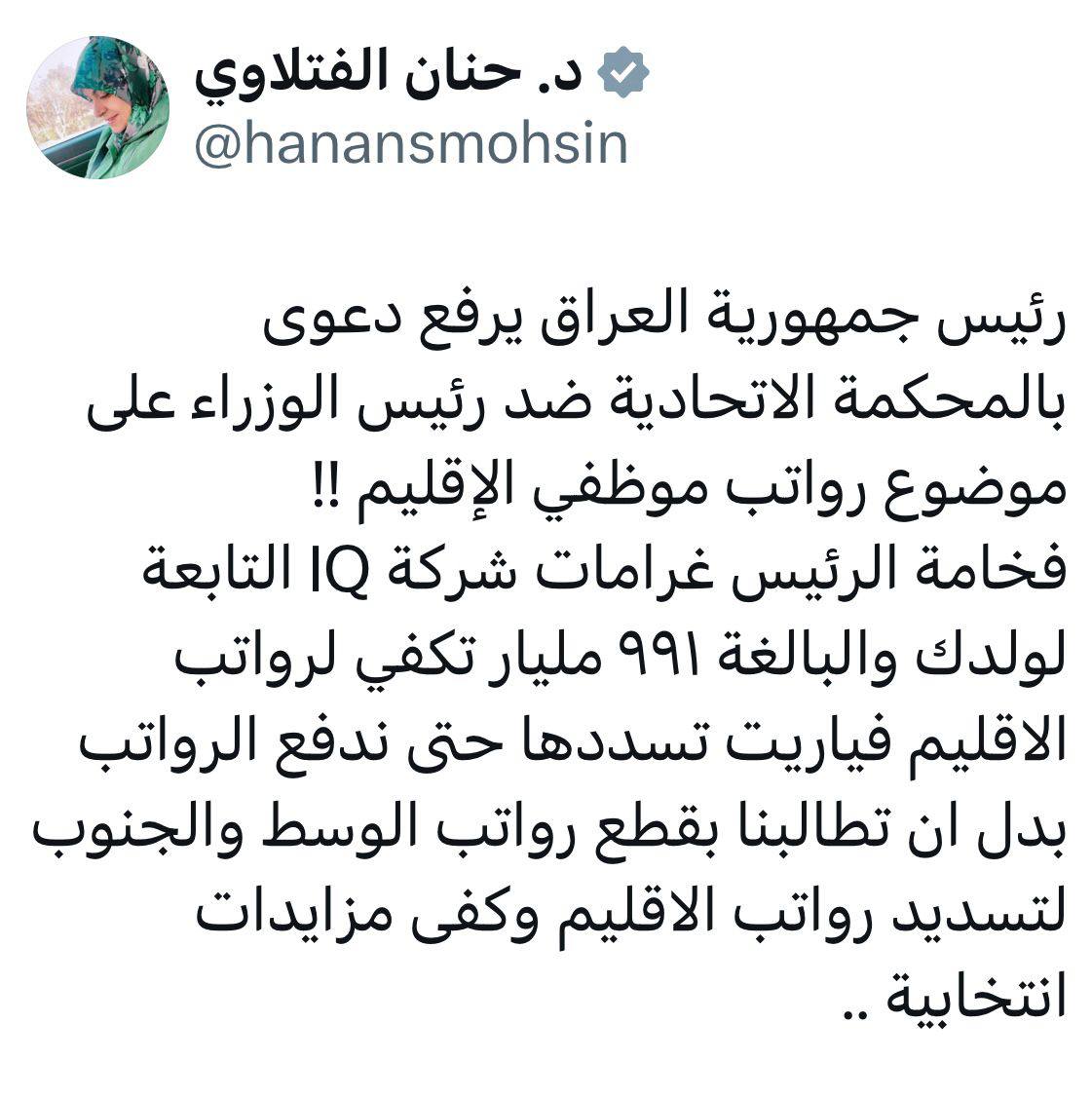 النائب حنان الفتلاوي : رئيس الجمهورية يرفع دعوى قضائية ضد رئيس الوزراء على رواتب موظفي الاقليم وغرامات شركة IQ التابعة لولدك البالغة 911 ملياراً تكفي لرواتبهم
