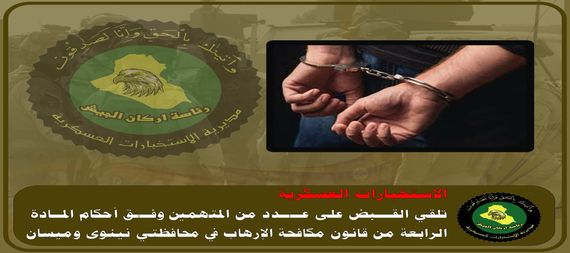 وذكرت المديرية في بيان ، انه :" بعملياتٍ استباقية وجهد استخباري مميز ووفقاً لمعلومات استخبارية دقيقة ، تم القبض على عددٍ من المتهمين وفق احكام المادة الرابعة من قانون مكافحة الإرهاب الذين ينتمون إلى تنظيم مايسمى داعش الارهابي في قضاء البعاج ومدينة الموصل، ومتهمين آخرين بنفس المادة القانونية بالدكة العشائرية في قضاء المجر الكبير بمحافظة ميسان".