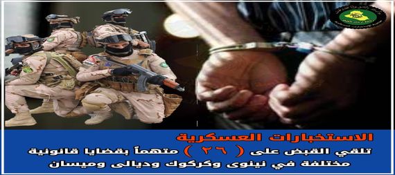 القت الاستخبارات العسكرية القبض على ( ٢٦ ) متهماً بقضايا قانونية مختلفة في عدد من المحافظات .