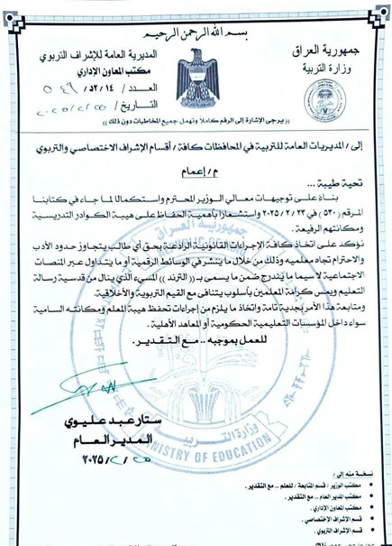 اتخذت وزارة التربية، إجراءات قانونية مشددة بحق الطلبة الذين يتجاوزون حدود الادب والاحترام تجاه المعلمين