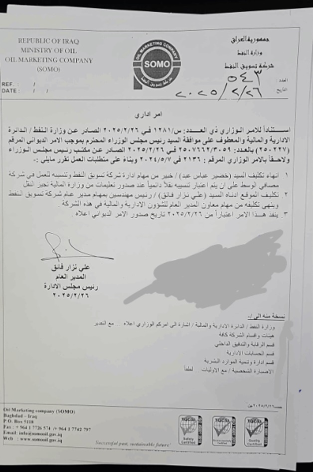 انهت شركة تسويق النفط العراقي "سومو"، تكليف مدير عام الشركة خضير عباس من منصبه، وذلك بعد حوالي 8 اشهر على تكليفه.