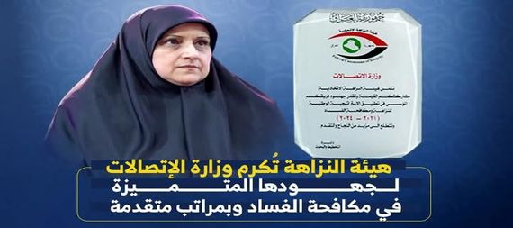 كرمت هيئة النزاهة الاتحادية وزيرة الاتصالات الدكتورة هيام الياسري تثمينا لجهودها المتميزة في مكافحة الفساد المالي والاداري من خلال تطبيق الاستراتيجية الوطنية للنزاهة ضمن الخطط والتوقيتات الزمنية الموضوعة لها.
