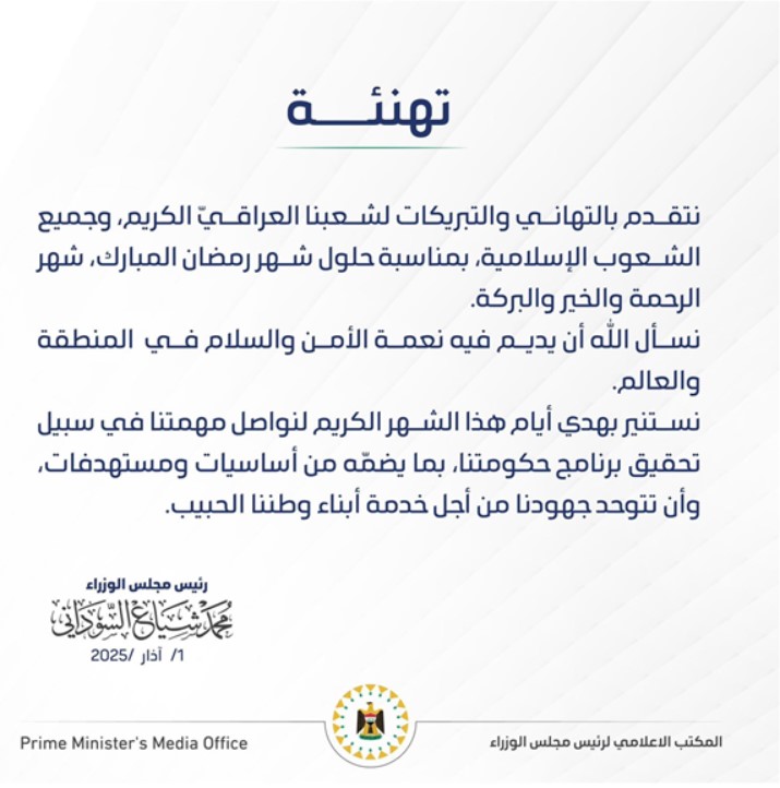 وقال السوداني في بيان "نتقدم بالتهاني والتبريكات لشعبنا العراقي الكريم، وجميع الشعوب الإسلامية بمناسبة حلول شهر رمضان المبارك، شهر الرحمة والخير والبركة".